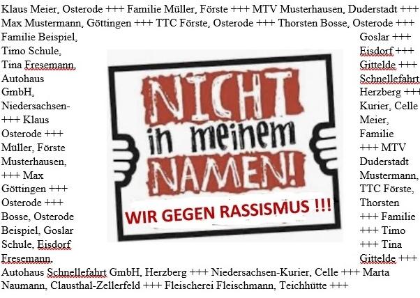 Unter dem Motto "Nicht in meinem Namen - Wir gegen Rassismus" hat der TTC Förste eine Aktion ins Leben gerufen.