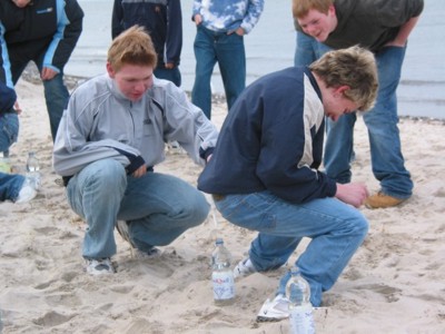 Ein etwas außergewöhnliches Spiel sorgte bei den älteren Jugendlichen am Strand für Erheiterung, während sich die jüngeren Teilnehmer durch einen kleinen Hindernisparcours auf dem Parkplatz kämpfen mussten. Anschließend ging's wiederum in die Schwimmhalle und auf den Hartplatz, und auch die ersten Ideen für die